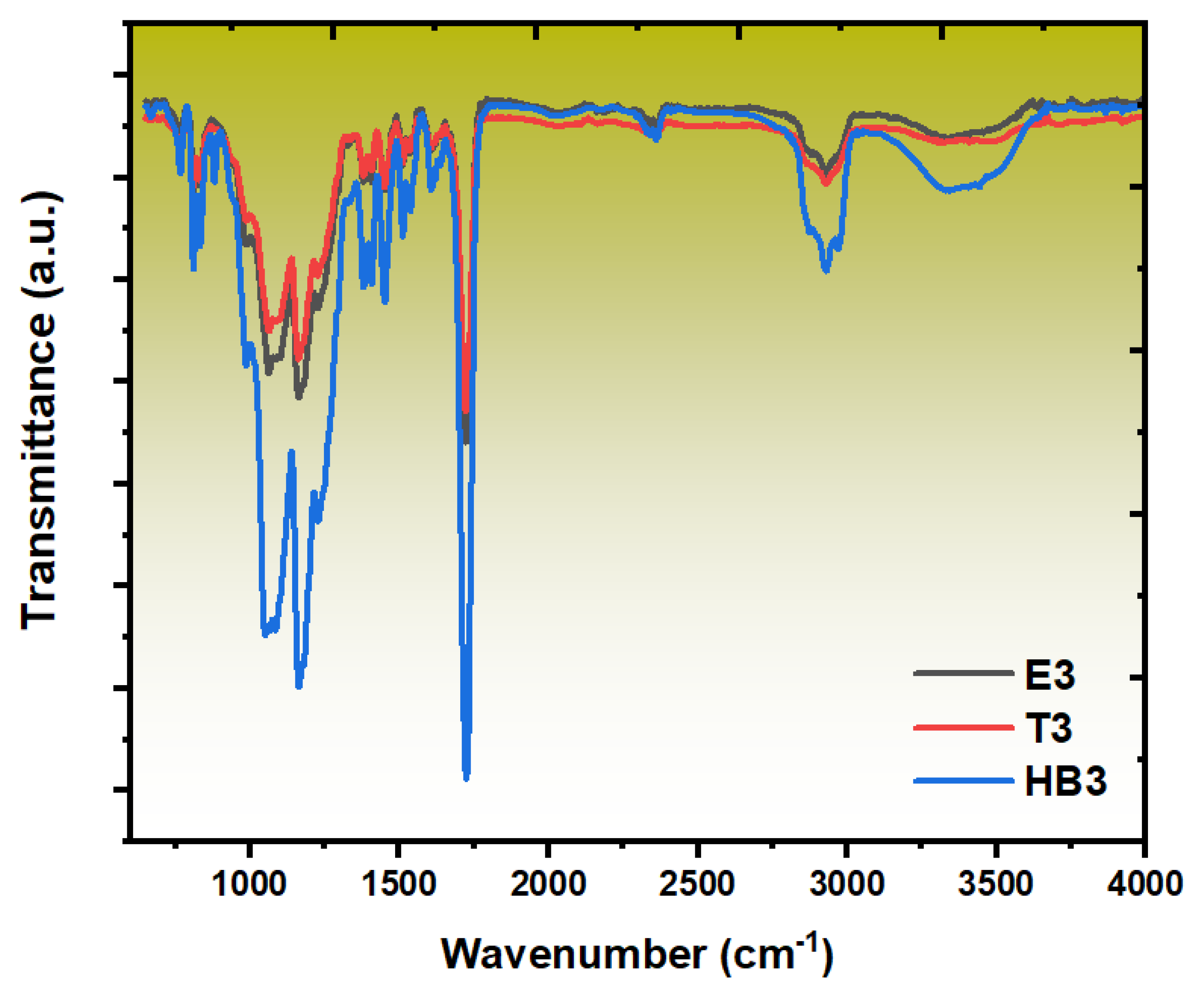 Figure 9 shows the FT-IR spectra of E3, T3, and HB3 composites. The E3 composite spectrum displays distinctive peaks indicative of the lignocellulosic components embedded within the crosslinked epoxy matrix. A notable broad absorption band in the 3200–3600 cm−1 range confirms the presence of hydroxyl groups linked to both cellulose and hemicellulose from ASW, as well as residual hydroxyl groups from the epoxy resin itself. These observations align with findings by Sahoo et al. [55], which emphasize the role of hydroxyl groups in forming hydrogen bonds between lignocellulosic fibers and epoxy resins, thereby enhancing adhesion and mechanical properties of composites. Similarly, Karumuri et al. [56] emphasize the significance of hydrogen bond interactions in epoxy–lignocellulose composites, highlighting their influence on the structural integrity and performance of thermoset materials.