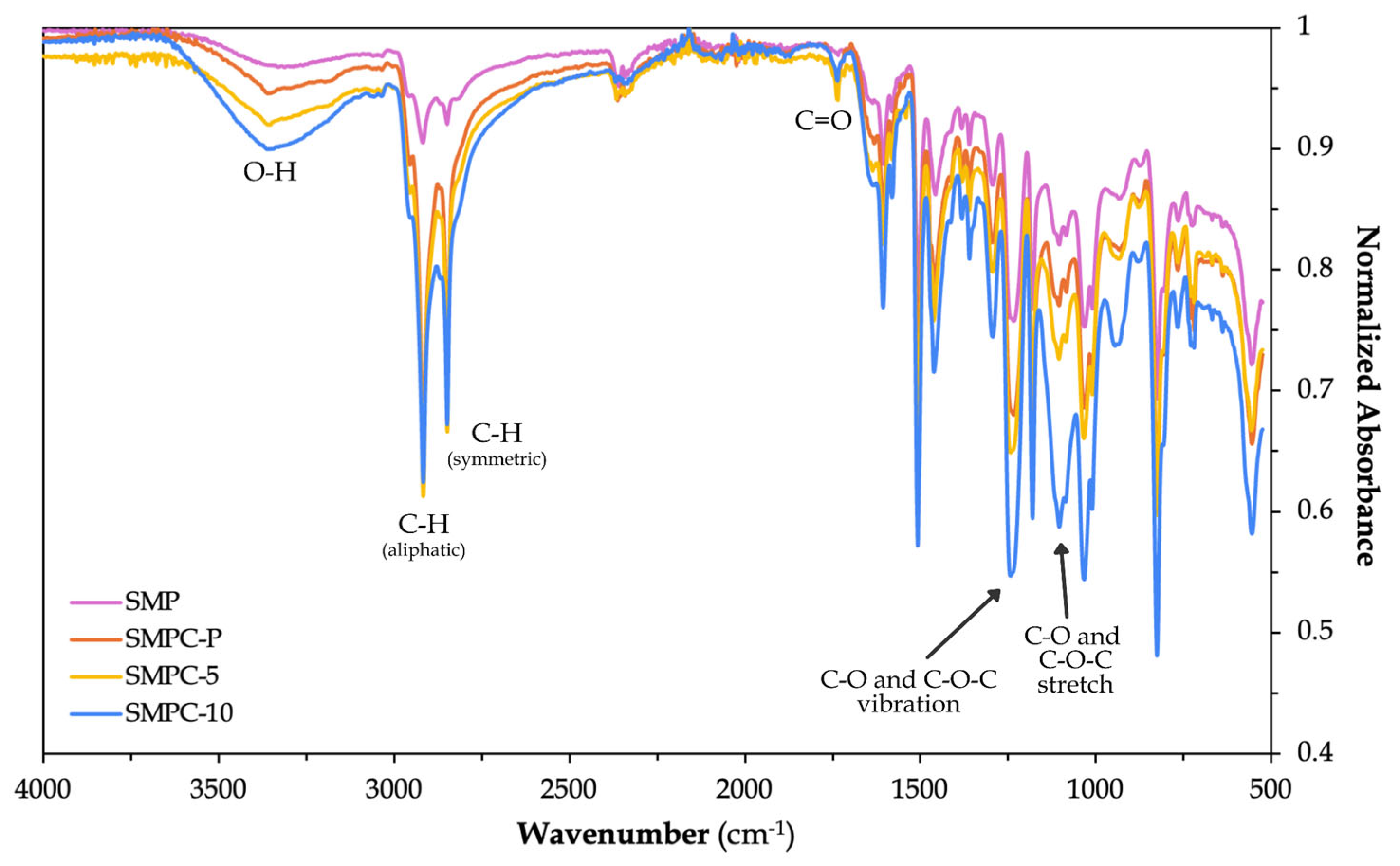SMP | 3312.52 | 2918.22 | 2849.04 | Absent | Similar peaks (1600–500 cm−1) |