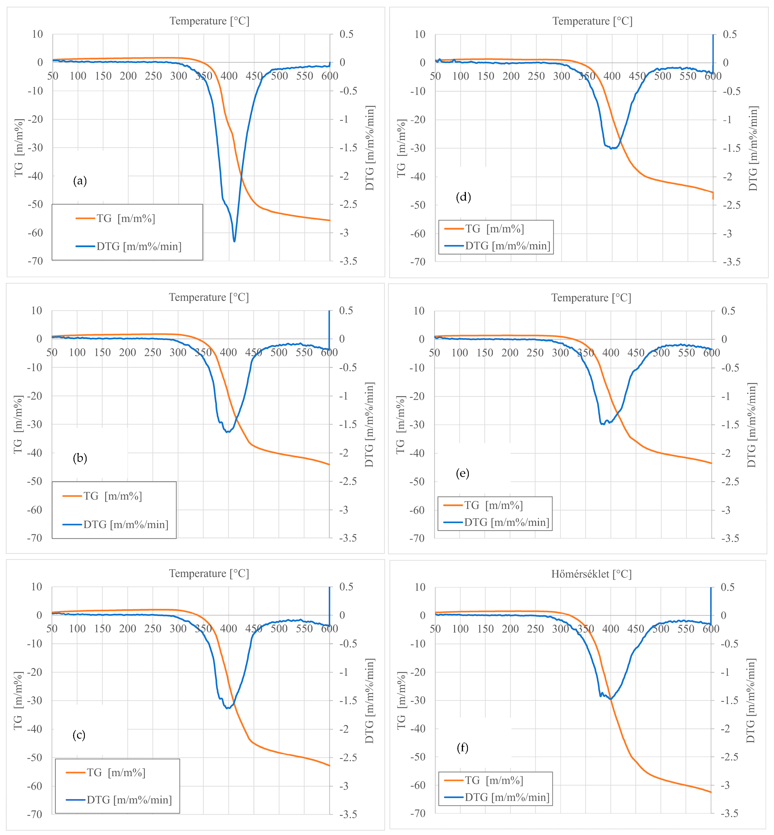 3.1. Thermogravimetric Analysis of Virgin and Recycled PK-GF Composites