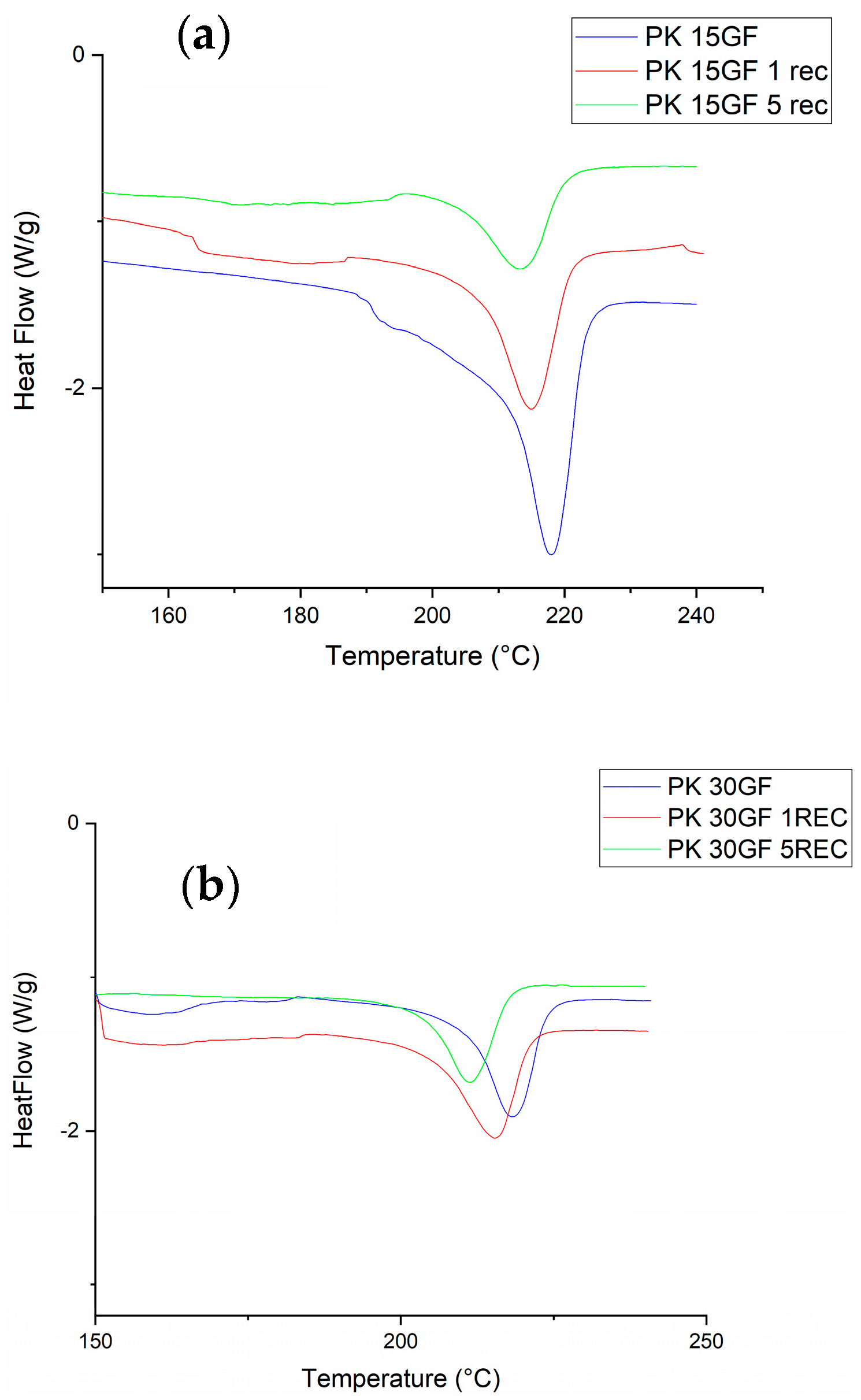 3.2. Differential Scanning Calorimetry (DSC) of Virgin and Recycled PK-GF Composites