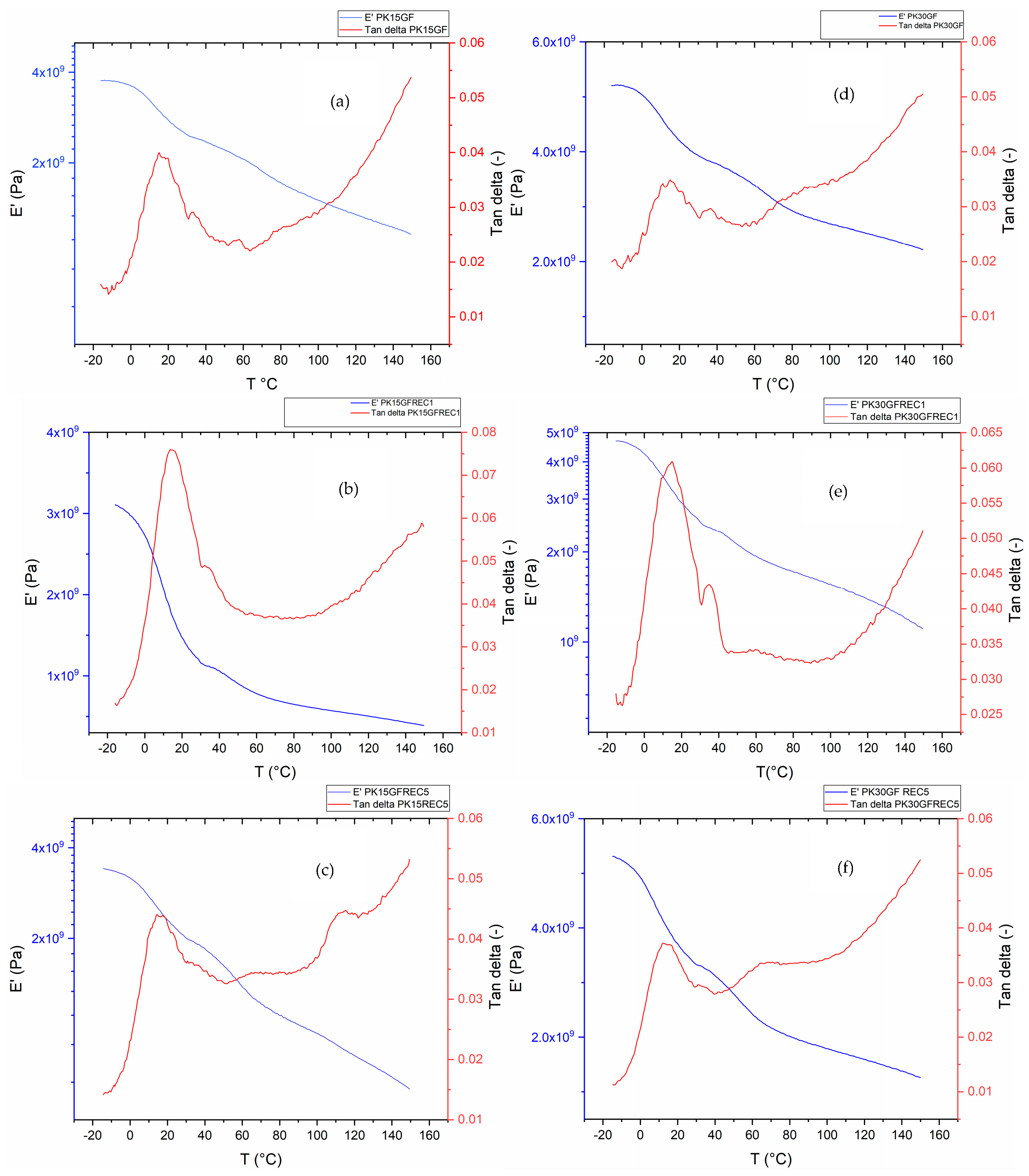 3.3. Dynamic Mechanical Analysis of Virgin and Recycled PK/GF Composites