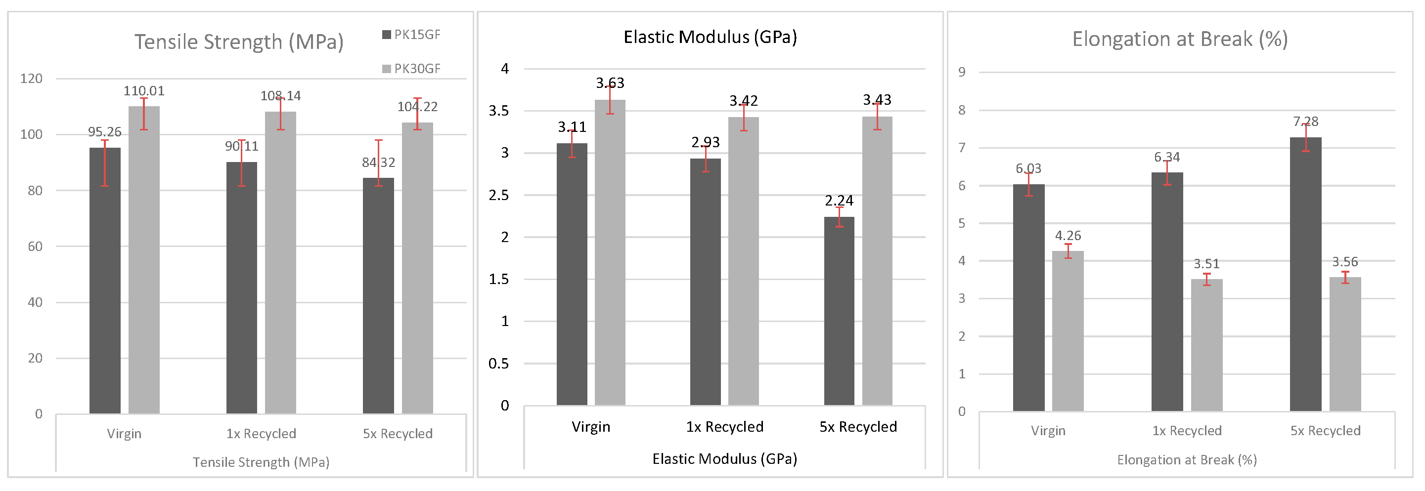 3.4. Mechanical Behavior of Recycled PK-15GF and PK-30GF Composites