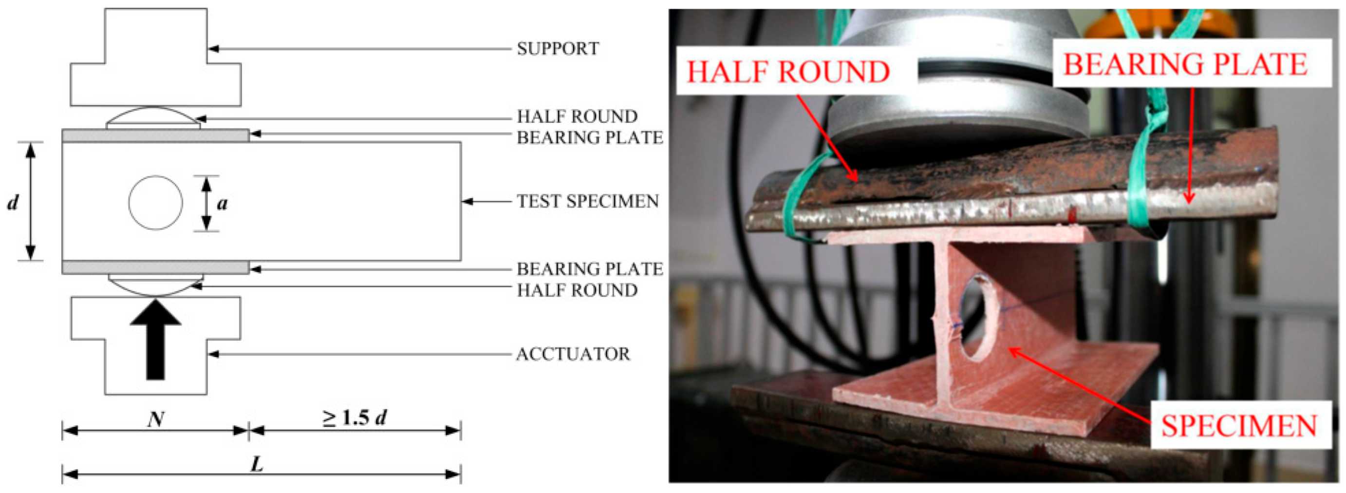 - Haloi, J.; Singh, K.D.; Borsaikia, A.C. Effect of web perforation on the performance of pultruded GFRP wide-flange section profile in web crippling under end-two-flange loading configuration. Thin-Walled Struct. 2022, 175, 109187. [Google Scholar] [CrossRef]