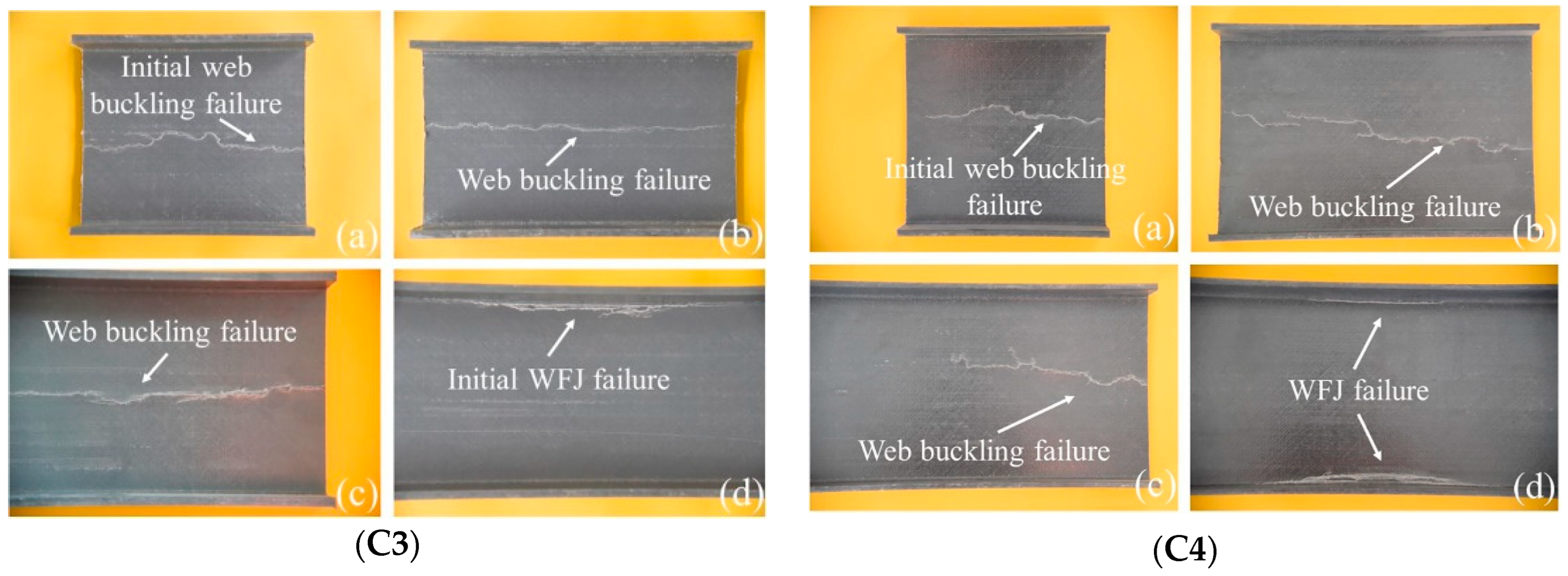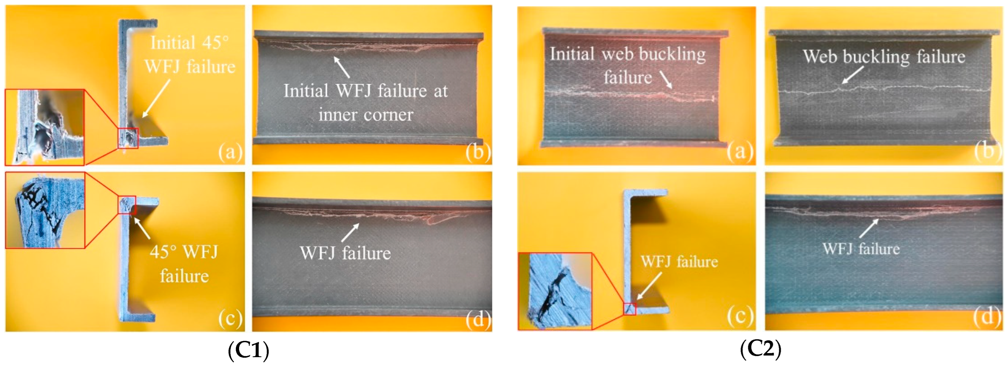 [54] | ETF, ITF, EG, IG | Rectangular hollow pultruded GFRP sections | WFJ failures, Bending crack (web bucking), longitudinal wrinkling cracks |