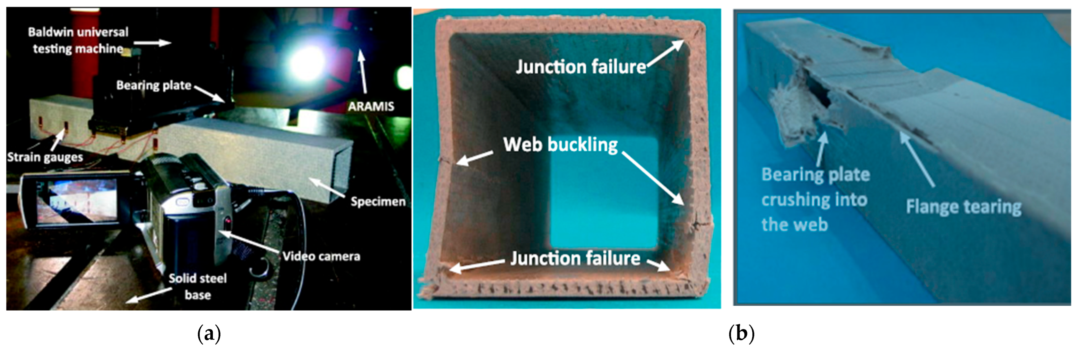 - Estep, D.D.; GangaRao, H.V.; Dittenber, D.B.; Qureshi, M.A. Response of pultruded glass composite box beams under bending and shear. Compos. Part B Eng. 2016, 88, 150–161. [Google Scholar] [CrossRef]