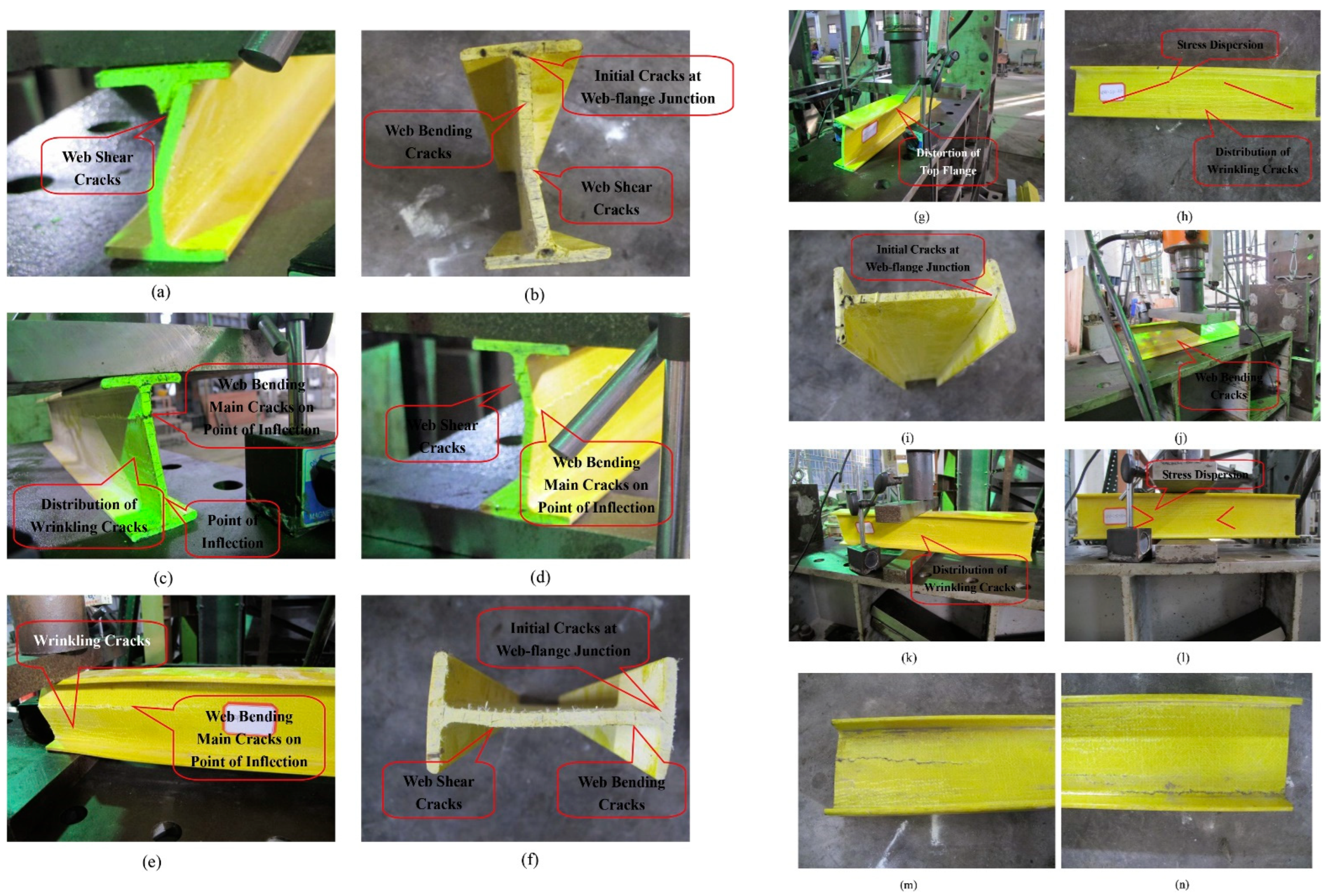 [53] | ETF, ITF, EG, IG | GFRP I-Sections | longitudinal bending cracks, bending wrinkling cracks and shear cracks. |