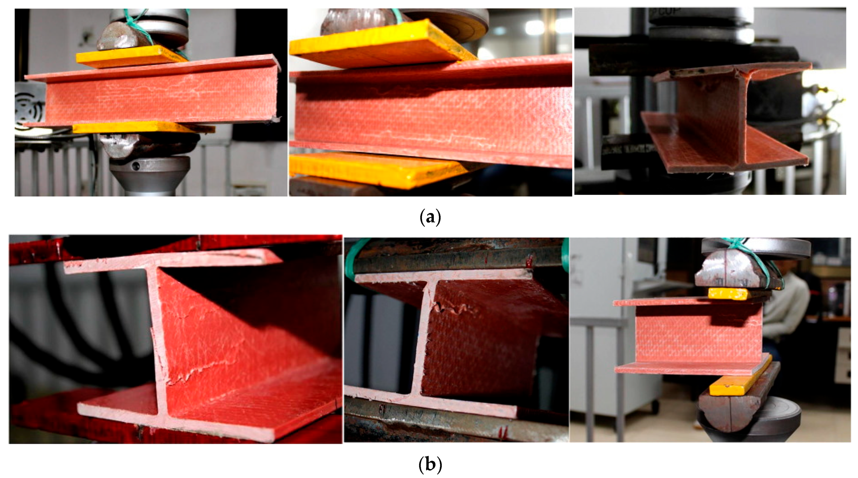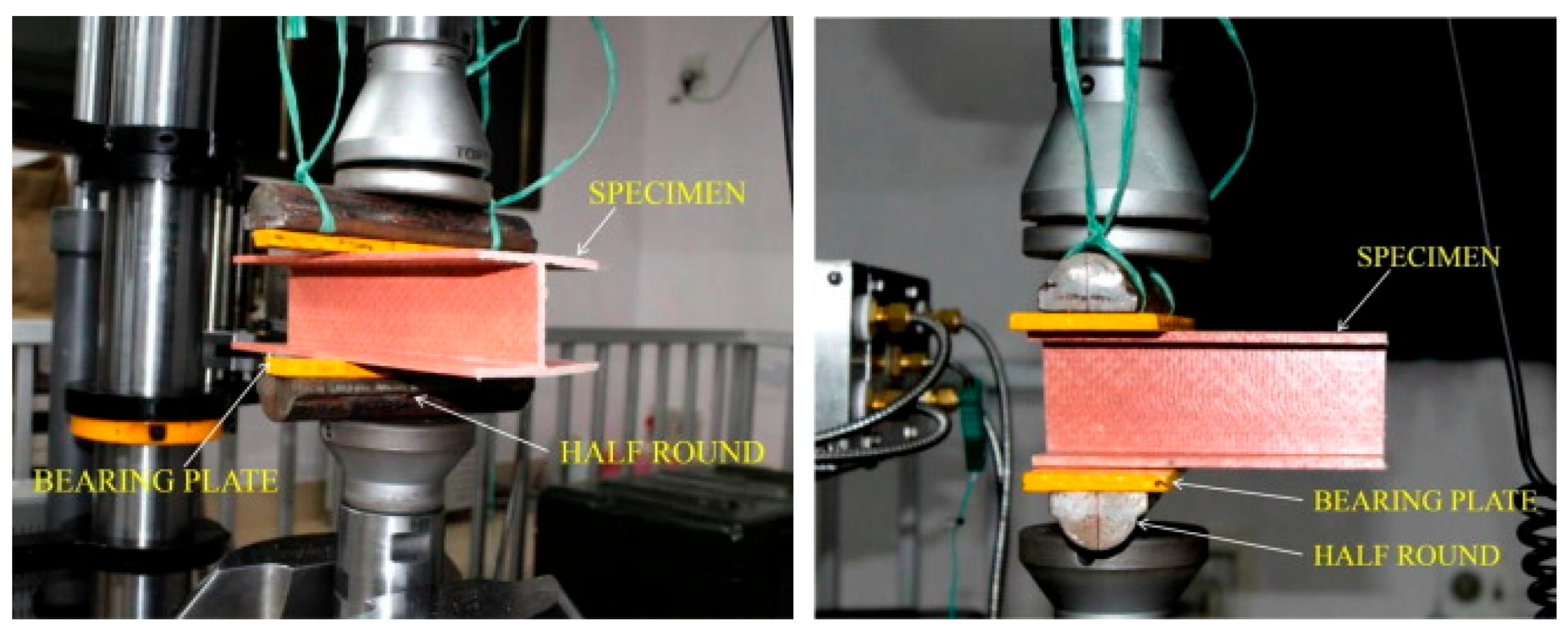 - Haloi, J.; Mushahary, S.K.; Borsaikia, A.C.; Singh, K.D. Experimental investigation on the web crippling behaviour of pultruded GFRP wide-flange sections subjected to two-flange loading conditions. Compos. Struct. 2021, 259, 113469. [Google Scholar] [CrossRef]
