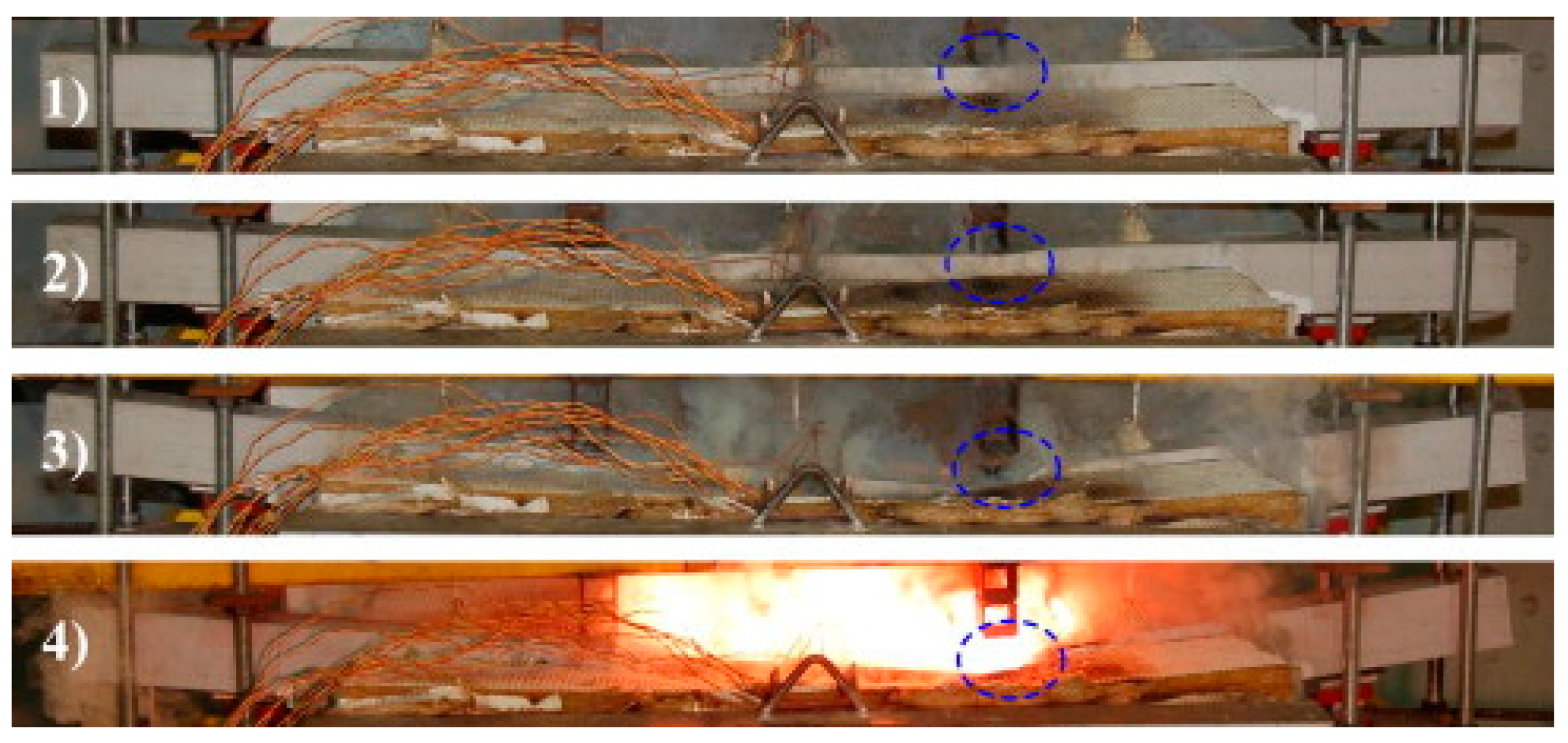 - Ludwig, C.; Knippers, J.; Hugi, E.; Ghazi Wakili, K. Damage of flexural loaded composite beams subjected to fire. In Proceedings of the 4th International Conference on FRP Composite in Civil Engineering, Zurich, Switzerland, 22–24 July 2008. [Google Scholar]