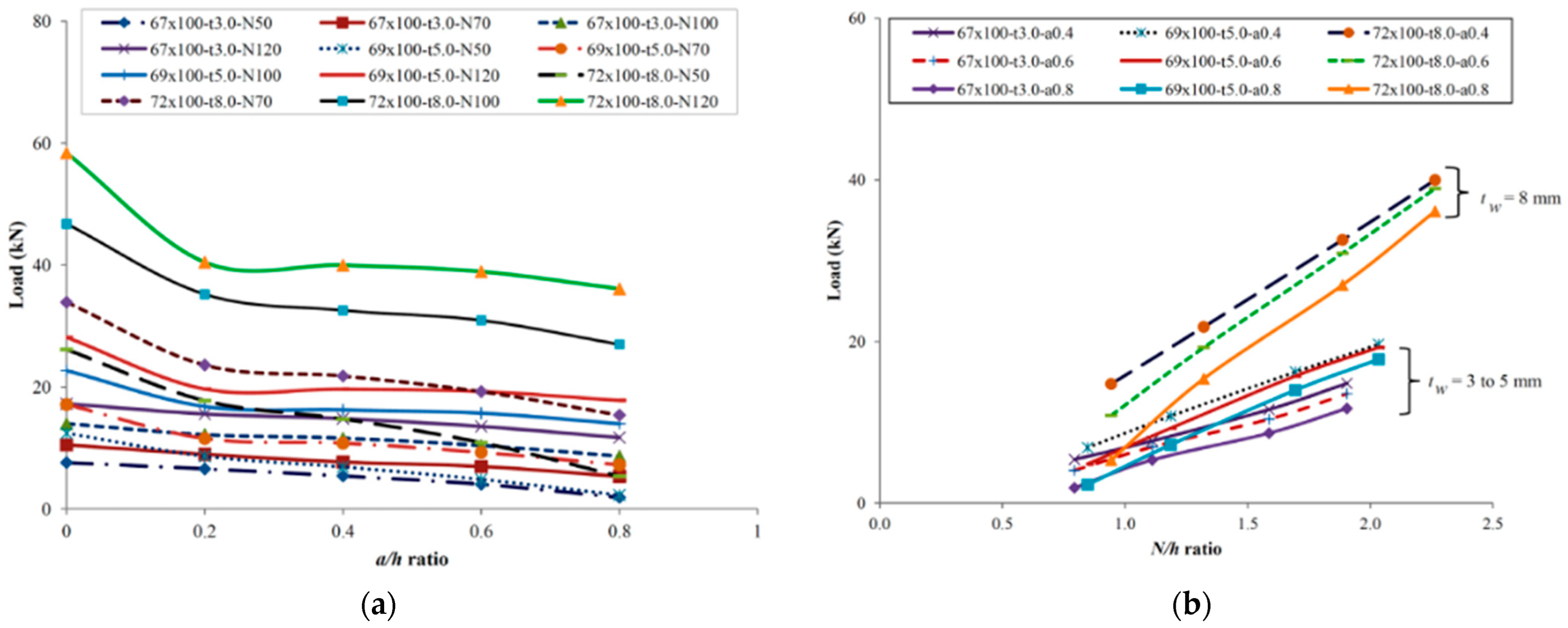 - European Convention for Constructional Steelwork; Associacao Portuguesa de. Design of Cold-Formed Steel Structures: Eurocode 3: Design of Steel Structures. Part 1–3 Design of Cold-Formed Steel Structures; John Wiley & Sons: Hoboken, NJ, USA, 2013. [Google Scholar]
