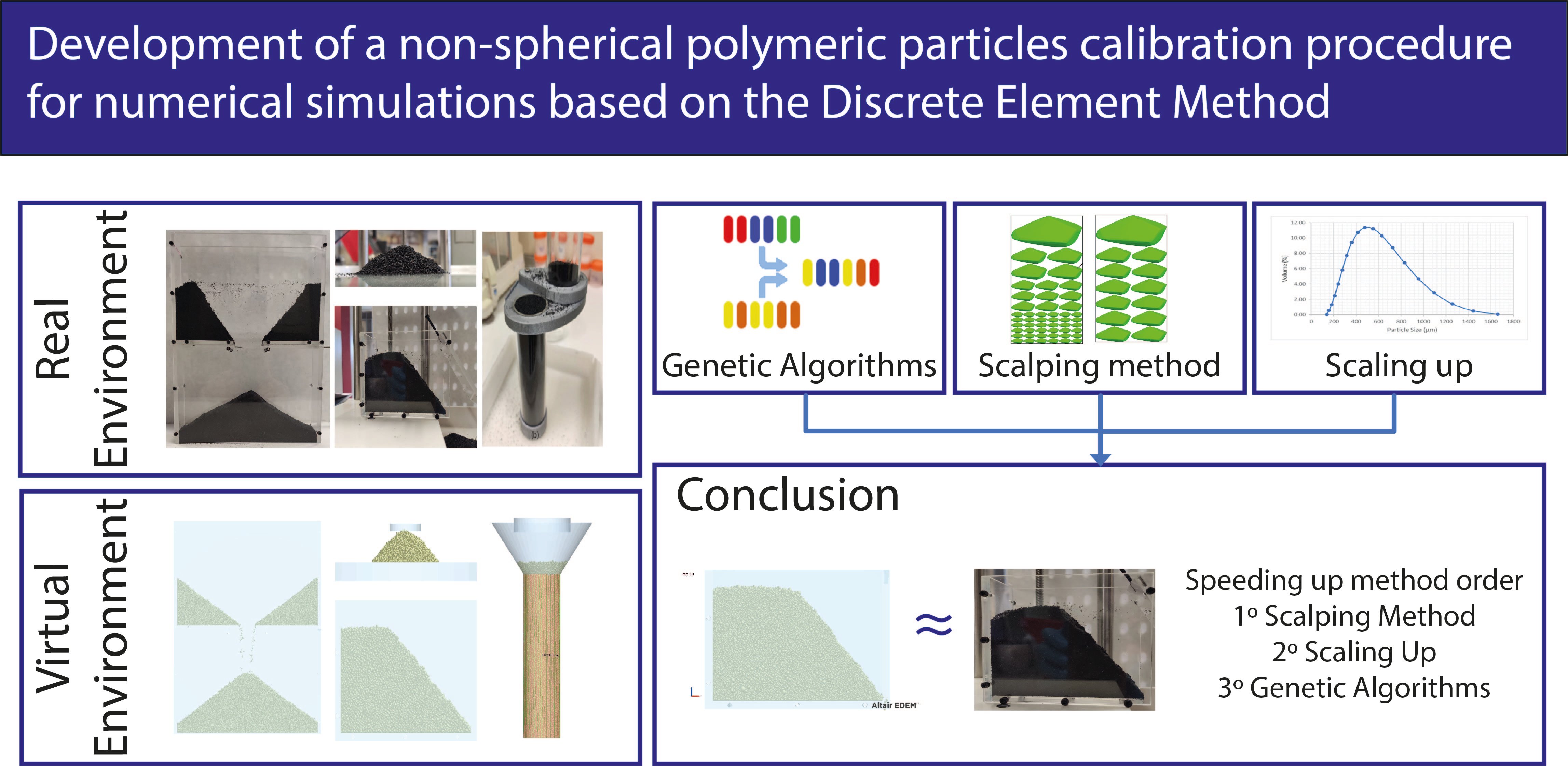 The manufacturing industry, in general, and the plastic industry, in particular, have been developing new materials and process methods that need a correct study and optimization. Nowadays, the main approach to optimize these processes is using numerical methods and, in the case of particulate materials, the Discrete Elements Method to estimate the particles interactions. But those mathematical models use some parameters that depend on the material and must be calibrated, thus requiring an important computational and experimental cost. In this study, we integrate different speed-up procedures and present a general calibration method of Low-Density Polyethylene particles, to obtain the calibrated solid density and Poisson’s ratio of the material, the restitution, static and rolling friction factors in the particle-to-particle and particle-to-wall interactions, and the contact model variables (damping factor, stiffness factor, and energy density). For this calibration, four different tests were carried out, both experimentally and with simulations, obtaining the bulk density, the repose and shear angles, and the dropped powder. All these response variables were compared between simulations and experimental tests, and using genetic algorithms, the input parameters (design variables) were calibrated after 85 iterations, obtaining a Mean Absolute Percentage Error of the response variables lower than 2% compared to the experimental results.