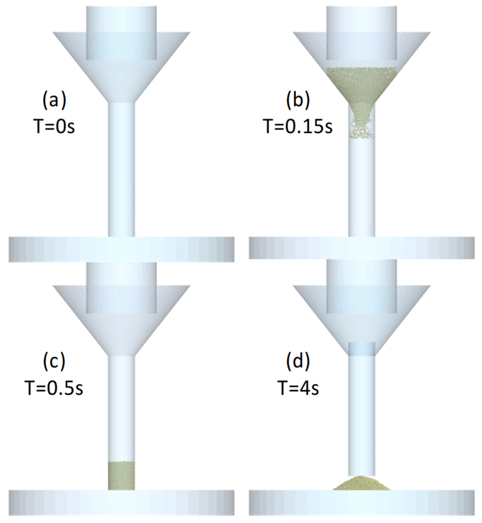 - Roessler, T.; Richter, C.; Katterfeld, A.; Will, F. Development of a Standard Calibration Procedure for the DEM Parameters of Cohesionless Bulk Materials—Part I: Solving the Problem of Ambiguous Parameter Combinations. Powder Technol. 2019, 343, 803–812. [Google Scholar] [CrossRef]