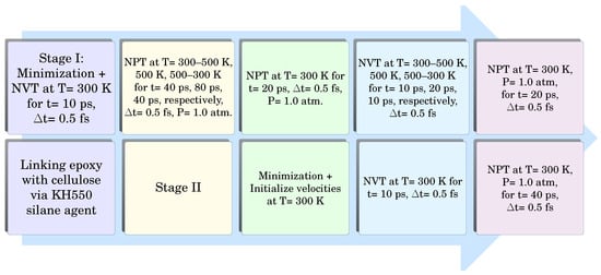 The equilibrium protocol of Figure 1 is applied to the molecular models clarified in Figure 4a,b. The protocol includes two stages to eliminate voids from the molecular models, both before and after the crosslinking process. The molecular models are compressed by applying the first stage of the equilibrium protocol. Then, the epoxy matrix is crosslinked with a crosslinking saturation of 50% applied to DGEB-F monomers using the crosslinking algorithm implemented in the Schrödinger 2021-2 software. The crosslinking process of the epoxy matrix is based on the NVT ensemble at T = 800 K and P = 1.0 atm for a total simulation time of 20 picoseconds with t = 2.0 femtoseconds. The amine ends of KH550 and TETA are crosslinked with the monomers of DGEB-F according to the reaction clarified in Figure 3b. If the epoxy matrix is reinforced with raw cellulose, then the hydrogen noncovalent bonds are considered at the interface between cellulose and epoxy. However, in epoxy/silylated cellulose composites, the silane coupling agents of hydrolyzed KH550 form covalent bonds with cellulose through their silane ends on one side and connect the silylated cellulose to DGEB-F through their amine ends on the other side. After the crosslinking process is complete for epoxy and cellulose, the second stage of the equilibrium protocol is carried out to eliminate the voids generated by the formation of bonds between molecules.