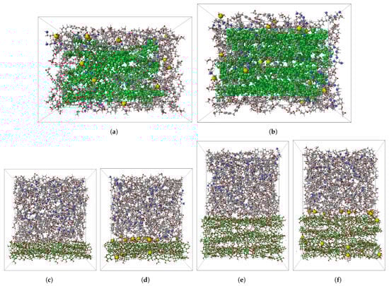 The ideal weight fraction for raw cellulose-derived fibers used to reinforce epoxy is identified as 40%. The epoxy/cellulose composite exhibits a maximum increase in its mechanical properties at this fiber content []. Consequently, the molecular models of epoxy composites are reinforced with two different weight fractions of cellulose at 28.1–28.3% and 43.9–44.1%. The molecular models of epoxy-KH550/cellulose composites shown in Figure 4a,b,d,f are generated by adding 20 molecules of KH550 to 30 molecules of TETA and 110 molecules of DGEB-F. The molecules of epoxy matrix (KH550/TETA/DGEB-F) are used to pack cells containing 10 and 20 cellulose chains. The unmodified epoxy/cellulose composite is obtained by adding 38 molecules of TETA to 114 molecules of DGEB-F, and the resulting epoxy matrix is used to pack 10 and 20 raw cellulose chains shown in Figure 4c and Figure 4e, respectively. The molecules in Figure 4c–f are rearranged to be appropriate for exploring the interfacial adhesion between epoxy and cellulose through the pull-out simulation.