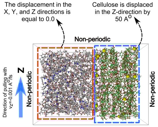 The pull-out simulation is used to verify the function of the KH550 silane coupling agent in improving the interfacial adhesion between epoxy and cellulose. The improvement in the interfacial adhesion is verified through the interaction energy and radial distribution function (RDF) when the cellulose chains are completely separated from epoxy. The RDF describes the probability (g(r)) of locating carbon atoms of epoxy near the reference carbon atoms of cellulose within the specified cutoff radius. The cutoff radius considered in this study for pull-out simulation is set to 12 Å. Figure 5 shows the boundary conditions, including displacement and velocity, used during the pull-out analysis. The steered MD command in the LAMMPS software is used to pull out cellulose from the epoxy composites. The epoxy matrix is fixed in all directions by assigning zero displacement to its molecules. The cellulose chains are moved by 50 Å in the Z-direction with a velocity equal to −0.001 Å/femtosecond. The negative sign is used with the velocity value since LAMMPS considers the cellulose chains as a spring that should be pulled for the achievement of positive displacement in the Z-direction. If a positive sign is used with the velocity value, then LAMMPS will push the cellulose chains in the negative Z-direction. The total number of time steps is 200,000 with t = 0.1 femtosecond. The pulling force is recorded for every time step, while the displacement of the cellulose chains is calculated by the subtraction of the current location of the chains at every time step from their initial location. The non-bonded interaction energy between the molecules of epoxy and cellulose is evaluated by applying the compute group/group command of LAMMPS. The bonding energy, which is associated with bonds of epoxy, cellulose, KH550, and the bonds formed among each other, can be predicted by activating only the bonding energy component of the potential energy and then using the commands of compute pe/atom and reduce sum of LAMMPS; the bonding energy in cellulose, epoxy, and KH550 can be obtained.