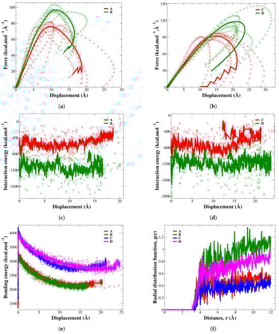 The force and interaction energy responses of epoxy composites reinforced with cellulose at (a,c) 28.1–28.3 wt.% and (b,d) 43.9–44.1 wt.%; (e) the bonding energy of epoxy composites; (f) the RDF of C (cellulose)–C (epoxy); A: epoxy/cellulose (28.3 wt.%); B: epoxy-KH550/cellulose (28.1 wt.%); C: epoxy/cellulose (44.1 wt.%); D: epoxy-KH550/cellulose (43.9 wt.%).