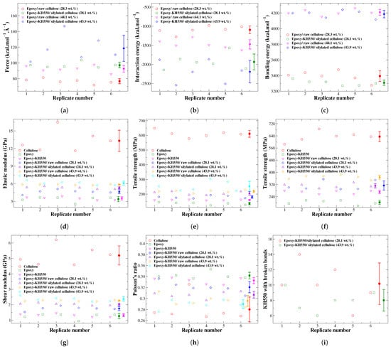 The interfacial and mechanical properties of molecular models’ replicates and their average values are presented. (a) Pulling force; (b) interaction energy; (c) bonding energy; (d) elasticity; (e) strength (PCFF/PCFF+); (f) strength (ReaxFF); (g) shear modulus; (h) Poisson’s ratio; (i) the number of KH550 with ruptured bonds.