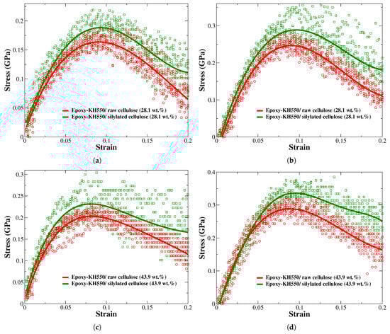 The stress–strain responses retrieved from the tensile test for epoxy/cellulose composites. (a) Epoxy-KH550/raw cellulose (28.1 wt.%), PCFF/PCFF+; (b) epoxy-KH550/silylated cellulose (28.1 wt.%), ReaxFF; (c) epoxy-KH550/raw cellulose (43.9 wt.%), PCFF/PCFF+; (d) epoxy-KH550/silylated cellulose (43.9 wt.%), ReaxFF.