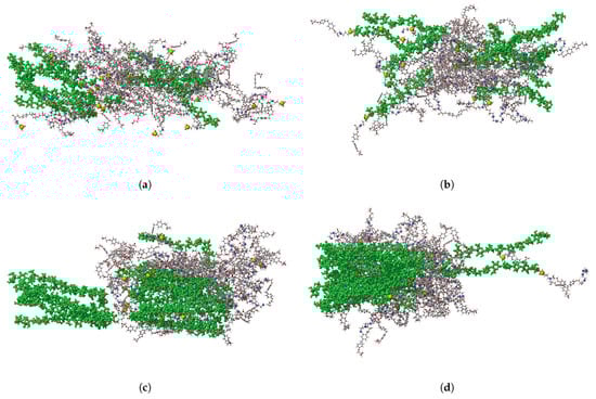 The cellulose considered in this study is not fully amorphous and contains large regions of crystalline cellulose in its structure. Therefore, the molecules of cellulose are designed with a backbone dihedral of 180° and a polymerization degree of 10. Afterwards, the cellulose chains are packed in a way similar to the ones clarified in Figure 2a. The cellulose chain includes amorphous and crystalline regions after applying the equilibrium protocol of Figure 1 to the packed chains. The molecules in the amorphous region are irregularly arranged with large voids, while the molecules in the crystalline region are arranged neatly and tightly. There is no obvious division between the amorphous and crystalline regions in the chain of cellulose, and it is a gradual transition state [].