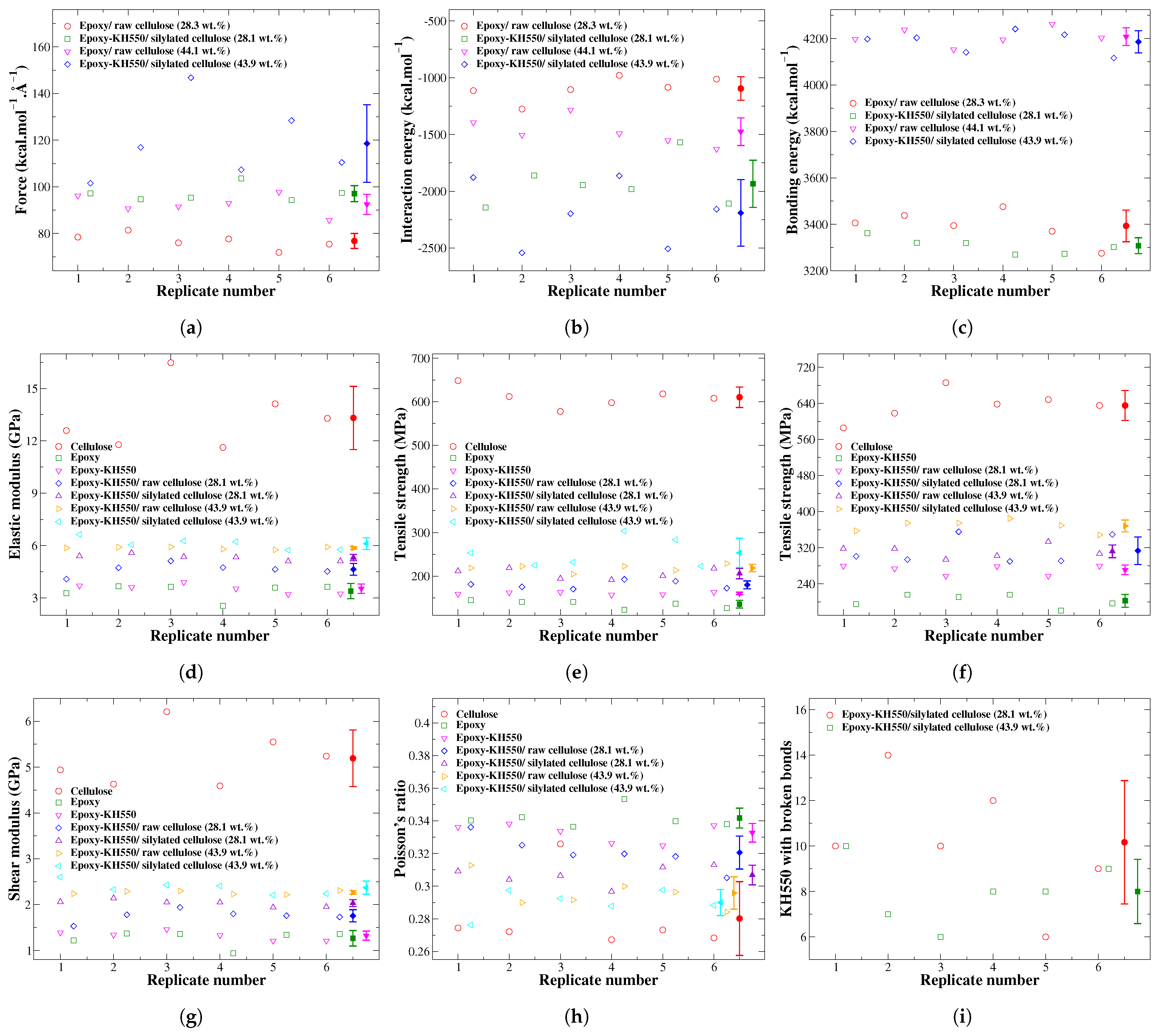 - Haque, E.; Kalaitzidou, K.; Wu, X. A molecular dynamics study of the effects of silane and cellulose nanocrystals at a glass fiber and epoxy interphase. Cellulose 2024, 31, 11243–11258. [Google Scholar] [CrossRef]