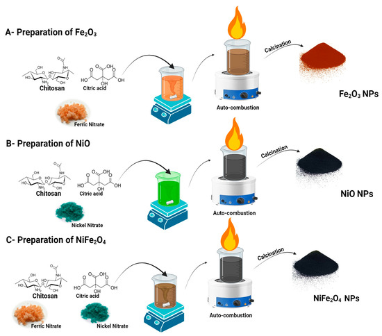 Chitosan (3 g) was dissolved in a 0.1 M acetic acid solution. Ten grams of each metal precursor were dissolved in 50 mL of deionized water and added to the chitosan solution. The metal precursor solutions for NiFe2O4 were mixed before being combined with the chitosan. The solution was stirred continuously in a magnetic stirrer until homogeneous. Subsequently, 50 mL of 4% citric acid was added. At this point, the solution quickly changed to a deep black color, confirming the formation of nanoparticles (NPs). After two hours of magnetic stirring at 70 °C, a gel was formed. The gel was then auto-combusted and calcined at 500 °C for 4 h. Figure 1 shows the complete synthesis scheme of the prepared materials.