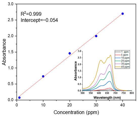 The concentration of MB dye was determined using a UV-VIS double-beam PC scanning spectrophotometer (UVD-2960) (Labomed, Inc., Los Angeles, CA, USA). A variety of concentrations of MB dye were prepared (1, 10, 20, 30, and 40 ppm). The standard curve of absorbance versus concentration is shown in Figure 2.