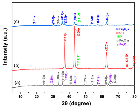 XRD patterns of (a) Fe2O3, (b) NiO, and (c) NiFe2O4 NPs.