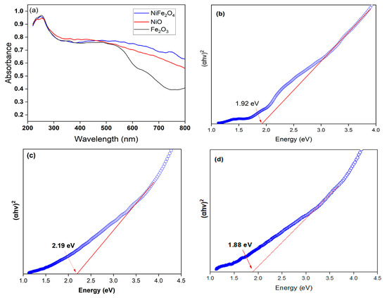 Optical properties of Fe2O3, NiO, and NiFe2O4 samples have been investigated using UV-vis Diffuse reflectance spectra (DRS). Figure 4a shows the absorbance spectra of as-prepared samples. Fe2O3 shows a steep absorption edge in the range of 400–550 nm. This can be returned to the Fe-O electronic transition [56]. The pure NiO exhibits a 423 nm absorption band edge in the visible region. Interestingly, the optical absorbance spectrum of the NiFe2O4 has excellent absorption the visible region. The values of band gap energy (Eg) of Fe2O3, NiO, and NiFe2O4 in were found to be 1.92, 2.19, and 1.88 eV, respectively, as shown in Figure 4b–d.