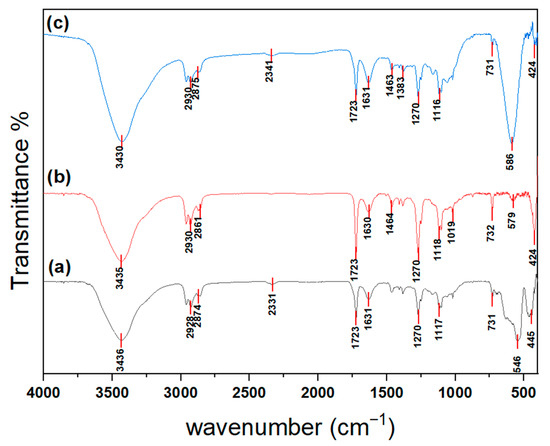 FTIR spectra of Fe2O3, NiO, and NiFe2O4 nanoparticles (NPs) are shown in Figure 5 and were compared with the FTIR spectra of chitosan in [57]. The peaks at around 3430, 3435, and 3436 cm−1 may result from overlapping stretching vibrations of O-H and N-H bonds. The peaks at around 1630 and 1631 cm−1 may be related to the bending vibrations of O-H. The peaks at around 2861, 2874, and 2875 cm−1 are attributed to amide band I. Furthermore, the peaks at around 1462, 1463, and 1434 cm−1 are caused by vibrations of the O-H within the ring. Additionally, the peaks at 1379 and 1383 cm−1 are associated with C-H vibrations within the ring. The broad bands around 1116 cm−1 include stretching vibrations of glycosidic bonds, C–O, and C–O–C in the skeleton structure of chitosan [57,58,59].