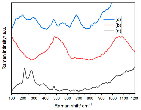 Raman spectroscopy is used to confirm the formation of crystalline and amorphous structures and to assess the purity of the samples. The Raman spectra of Fe2O3 in panel (a) confirm the rhombohedral structure of Fe2O3 based on space group No. 148 R-3 [68]. The Raman spectra presented in Figure 6a depict the characteristic features of the freshly prepared Fe2O3 sample. This Raman spectrum prominently reveals significant peaks associated with α-Fe2O3. Simultaneously, discernible signals can be attributed to magnetite (Fe3O4) and maghemite (γ-Fe2O3).