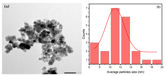 The TEM image in Figure 7a shows the aggregated spherical morphology of NiFe2O4 nanoparticles (NPs). The average particle size of NiFe2O4 NPs is 11.50 nm, calculated from the TEM image using ImageJ software (https://imagej.net/ij/) based on 20 particles, as shown in Figure 7b. By comparing the average particle size of NiFe2O4 NPs obtained from the TEM image with the crystallite size obtained from the XRD patterns, it is evident that they are close in value. The aggregation of NiFe2O4 NPs can be attributed to the high magnetic properties of the NiFe2O4 NPs.