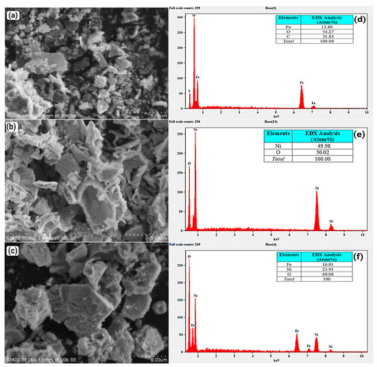 The SEM images of Fe2O3, NiO, and NiFe2O4 nanoparticles (NPs) are shown in Figure 8a–c. The particles are aggregated due to the magnetic properties of the NPs and the increased surface area, which leads to higher surface energies and strong interparticle attraction. This result agrees with [73]. The EDX spectra of the Fe2O3, NiO, and NiFe2O4 NPs are presented in Figure 8d–f. The EDX spectrum of Fe2O3 in Figure 8d confirms the formation of Fe2O3 with high purity. The carbon detected is a result of incomplete calcination of organic compounds [74]. In Figure 8e, the EDX spectrum of NiO shows the presence of Ni and O signals, confirming the high purity of the formed NiO NPs. The EDX spectrum of NiFe2O4 NPs in Figure 8f confirms the presence of Ni, Fe, and O in the nanocomposite structure. The high purity of the samples is confirmed by the absence of other peaks.