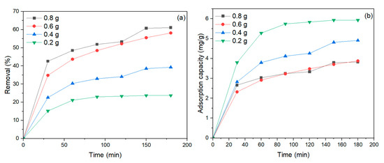 To effectively remove MB dye, the amount of NiFe2O4 nanoparticles (NPs) used is an essential aspect. The adsorbent amount was adjusted from 0.2 to 0.8 g/100 mL, with a pH of 6, dye concentration of 40 mg/L, and mixing time of 180 min. As clearly shown in Figure 9a, as the amount of NiFe2O4 NPs increased, the MB dye removal also increased. This is consistent with the fact that when the amount of NiFe2O4 increases, the surface area also increases, leading to a greater number of active sites necessary for the adsorption process of MB dye [75]. Consequently, the adsorption capacity of MB dye decreased as the amount of NiFe2O4 increased, as shown in Figure 9b. This result agrees with [76,77], as higher adsorbent dosages tend to agglomerate, reducing adsorption efficiency. The percentage of MB dye removal by NiFe2O4 increased with longer contact times, as illustrated in Figure 9a. Initially, the removal of MB dye was rapid until a certain point, after which the dye settled on the adsorbent surface, and contact time did not significantly affect the rate of removal [78]. According to the experimental results, the removal of MB dye showed little change when increasing NiFe2O4 from 0.6 g to 0.8 g; therefore, 0.6 g of NiFe2O4 was used in the subsequent experiments.