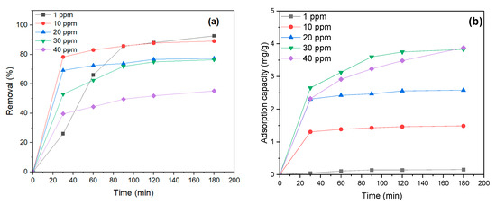 (a) Effect of MB dye concentration on the removal percentage and (b) effect of MB dye concentration on Adsorption capacity.