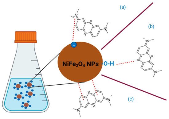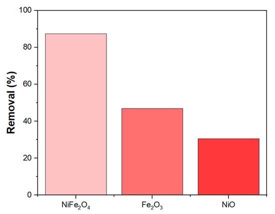 The synergistic effect of NiFe2O4 nanoparticles (NPs) is clearly observed in Figure 11, where the MB removal efficiency of NiFe2O4 is significantly better compared to Fe2O3 and NiO under constant parameters. This result agrees with findings from [80,81], which suggest that the presence of two metals can provide active sites that work together synergistically to adsorb the MB dye.