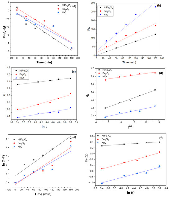Several kinetic models are commonly used to describe the adsorption process. Pseudo-first-order, Pseudo-second-order, Intra-particle diffusion, Liquid film diffusion, and Fractional power models were fitted to understand the nature of the adsorption of MB dye on the surface of NiFe2O4, Fe2O3, and NiO NPs.