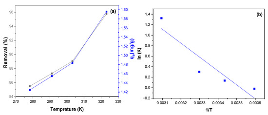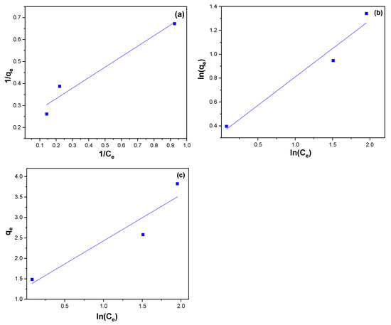 Elovich kinetic model describes second-order kinetics for a solid surface with heterogeneous energy, although it does not propose specific mechanisms for adsorption [83]. The linear equation of the Elovich model is expressed by Equation (7):