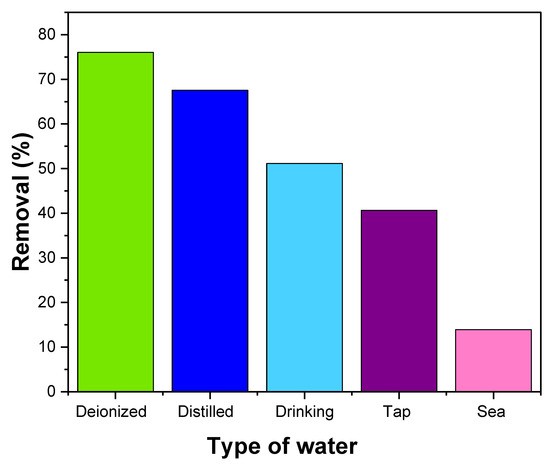 Tap water was collected from the laboratory at King Abdulaziz University in Jeddah. Before collecting the sample, the water was allowed to flow for seven minutes. Seawater samples were taken from the Red Sea. Both tap water and seawater were filtered twice to remove any solid particles. Mineral water was purchased from the Saudi market. Deionized and distilled water were obtained from the deionizer and distilled water units in the laboratory at King Abdulaziz University. Adsorption experiments were conducted in a 50 mL conical flask using 25 mL of methylene dye (10 ppm) solution and 0.15 g of adsorbent under ambient.