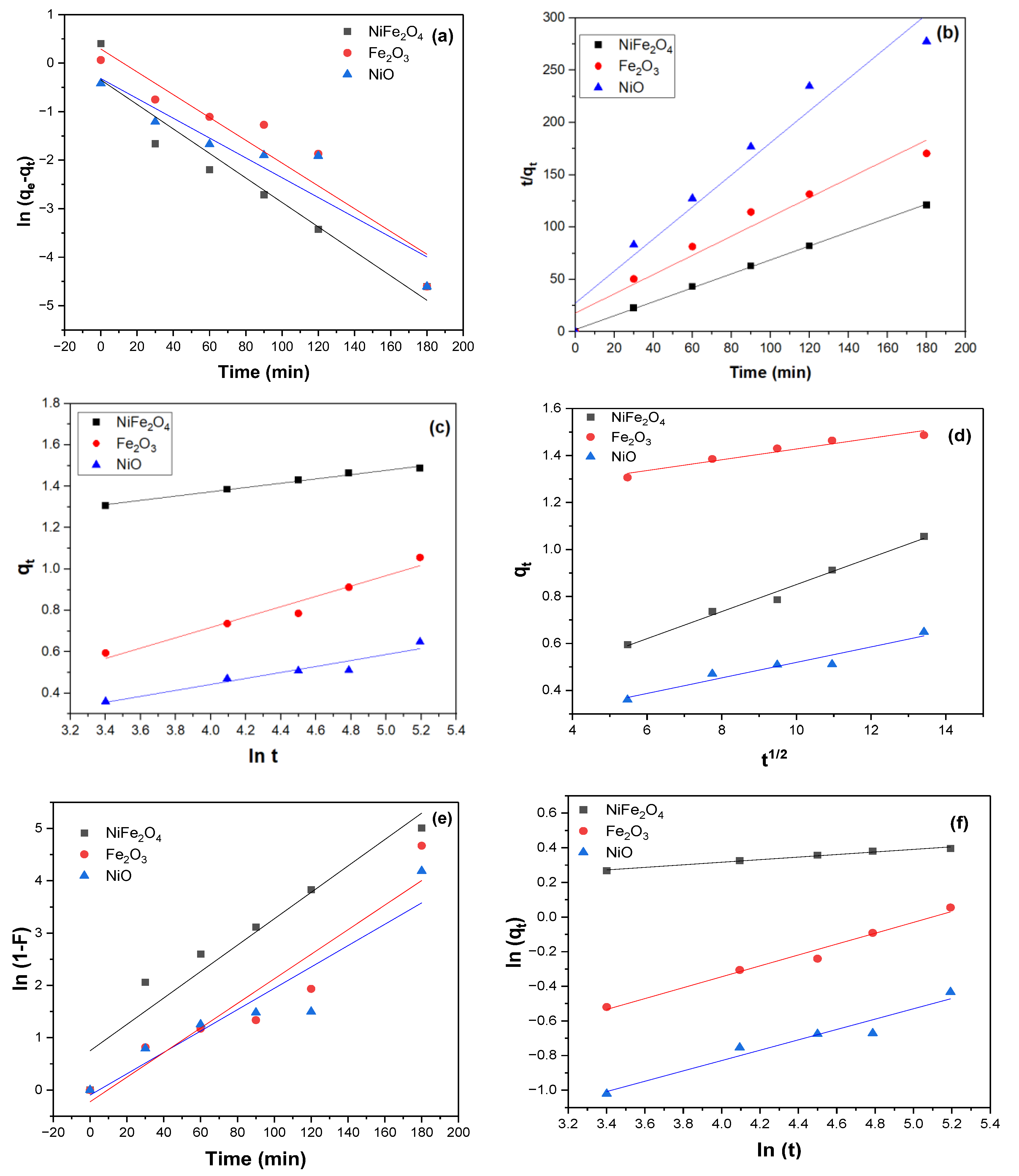 - Gayathri Manju, B.; Mathangi, J.B.; Raji, P.; Helen Kalavathy, M. Equilibrium and kinetic studies on methylene blue adsorption by simple polyol assisted wet hydroxyl route of NiFe2O4 nanoparticles. J. Environ. Health Sci. Eng. 2019, 17, 539–547. [Google Scholar] [CrossRef]