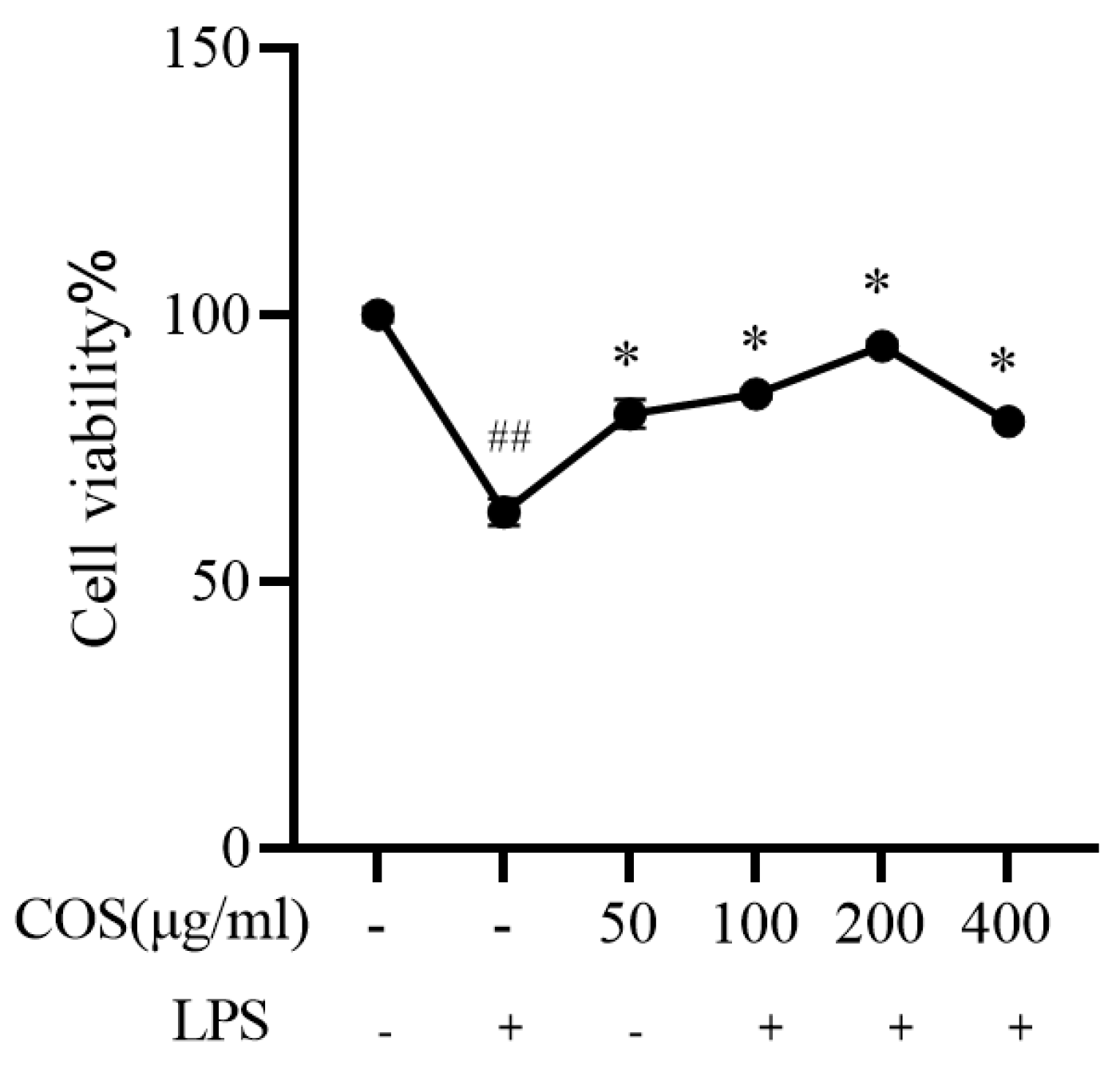 3.3.1. Protective Effect of COS on LPS-Stimulated Viability of Sea Cucumber Coelomocytes
