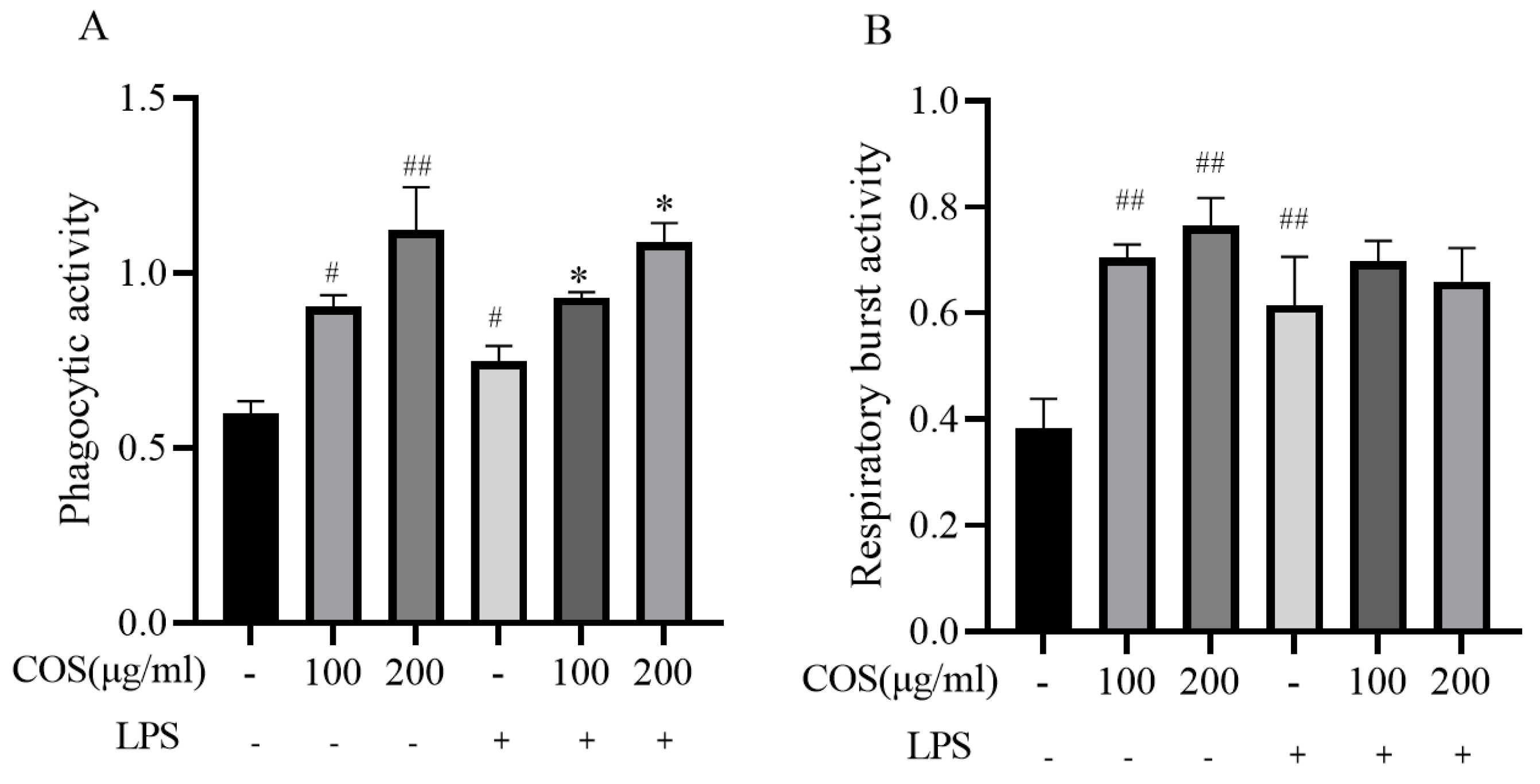 3.3.2. Effect of COS on Phagocytic Index and Respiratory Burst Viability of LPS-Stimulated Sea Cucumber Coelomocytes