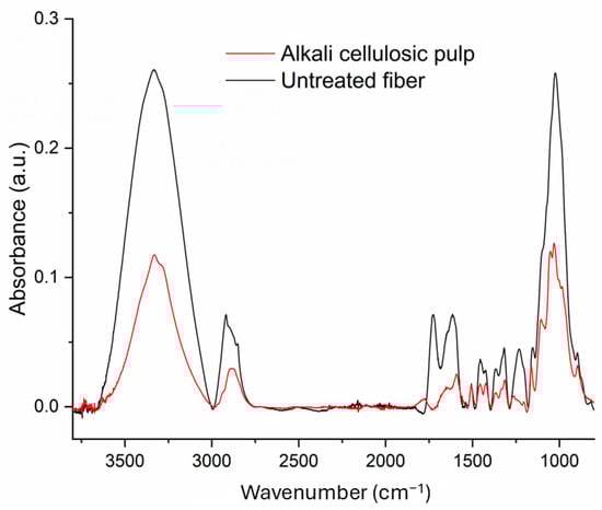 32], did not show variation after the alkali treatment. This behavior is consistent with the similar level of lignin found in the untreated fibers and alkali cellulosic pulp.