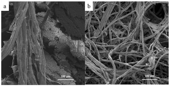 7]. Incorporating cellulosic pulp pine improved the mechanical properties due to individual strength, and the inter-bonding of long fibers was higher than that of short fibers. The resulting network exhibited a notable presence of hydrogen bonds that efficiently bonded with the short fibers, filling the void spaces [