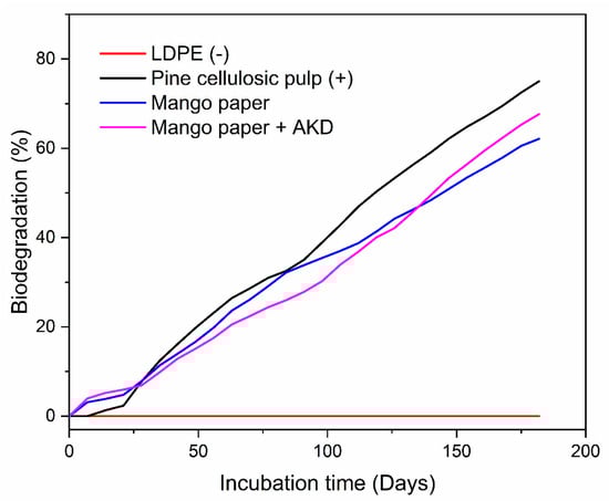 49]. At the end of the assay, the biodegradation percentage of mango paper + AKD was higher than that of mango paper; it could be attributed to the high humidity (50%) and alkali pH (8.65), which influenced AKD hydrolysis [