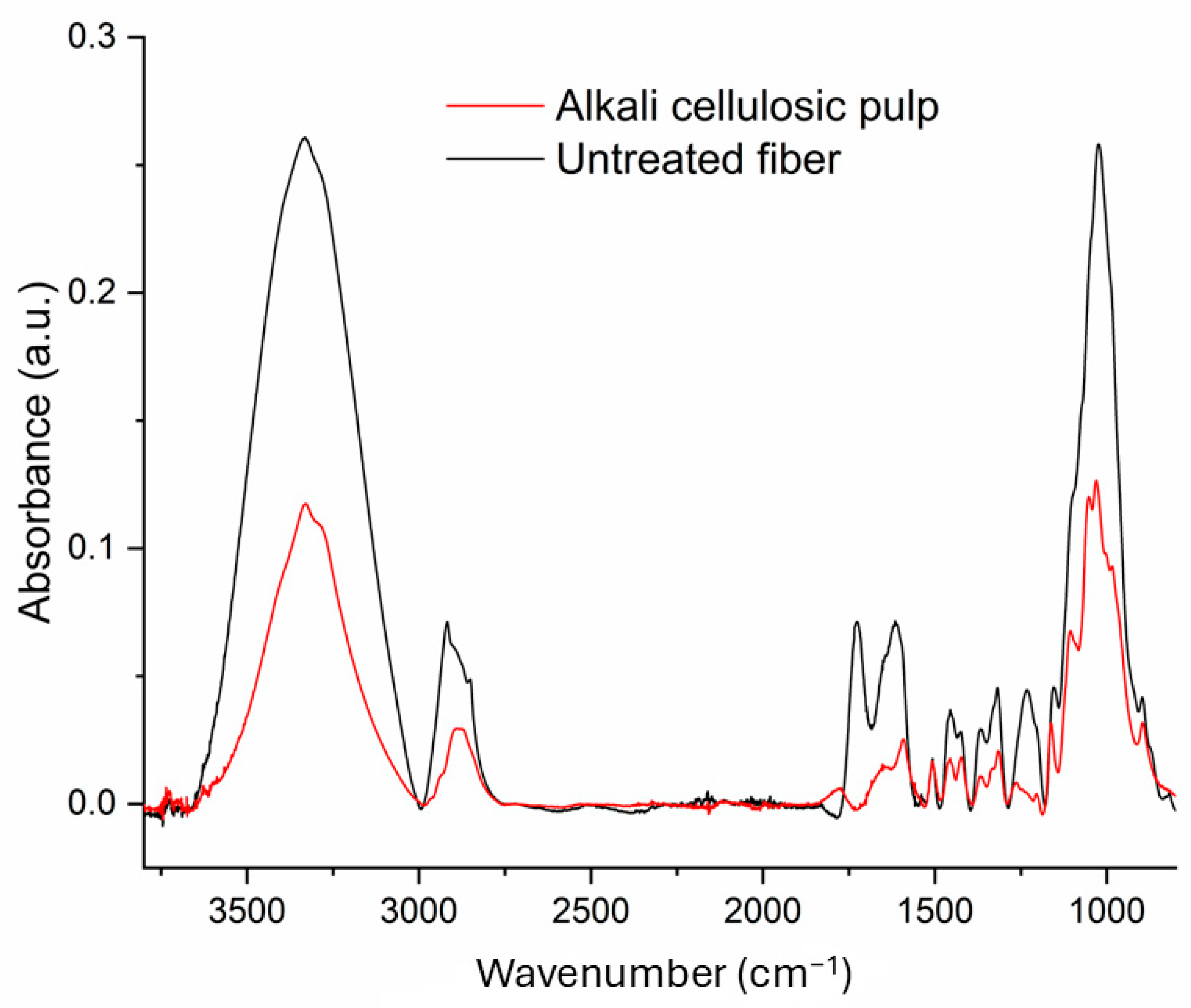 Figure 2 shows the FTIR spectra of untreated fibers and alkali-treated cellulosic pulp. The broad band observed in the range of 3000 to 3600 cm