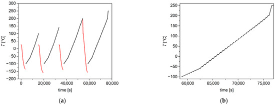 Temperature ramps used for BDS measurements. (a) Complete temperature cycle. Red curves are cooling ramps, while black curves are stepped heating ramps, when isothermal measurements are performed during the constant temperature periods. (b) Detail of a heating ramp, where isothermal steps are visible.