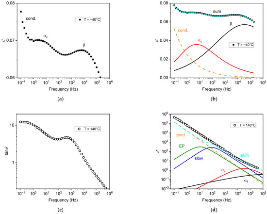 (a) Example of broadband dielectric isothermal spectrum at −40 °C for the A90(2) chitosan film annealed at 100 °C. In this illustrative spectrum, the imaginary permittivity ε’’ shows a peak corresponding to the secondary process (β) at higher frequency, a peak for the structural process (αc) at lower frequency, and a rise due to conductivity (cond.) for the lowest frequencies. (b) Fitting functions for the spectrum in (a) orange: conductivity (Equation (2)); red: primary relaxation (Equation (1)); black: secondary relaxation (Equation (1)); and cyan: sum of the three contributions. (c) Example of tanδ dielectric spectrum for the A0 sample annealed at Ta = 100 °C, for the temperature of T = 140 °C. (d) The ε″ spectrum for the same case. Contributions of single processes as obtained by fitting with the tanδ function (Equation (3)) are also reported.