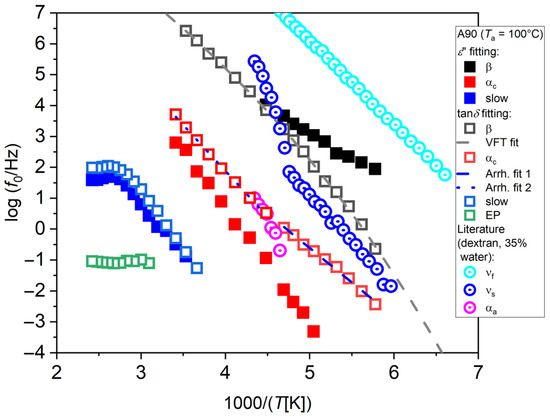 Relaxation plots for the A90 sample with Ta = 100 °C obtained by fitting of ε″ or tanδ data. The literature data for dextran, extracted from Ref. [24], are also reported for comparison.