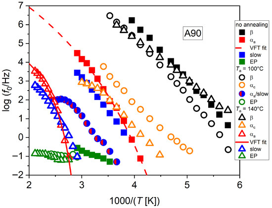 As an example, the relaxation plot for the sample A90 with Ta = 100 °C is shown in Figure 4. Relaxation frequencies obtained by fitting of ε″ and tanδ are compared here. Fitting results appear as sensibly different in the two cases. Fitting ε″ (full symbols) provides an Arrhenius process at low temperatures, labeled as β, an Arrhenius process at intermediate temperatures, labeled as αc, and an Arrhenius process at higher temperatures, labeled as slow, that flattens out at temperatures higher than 100 °C, which coincides with the annealing temperature Ta. By fitting of tanδ instead (open symbols), the process at low temperature assumes a slight VFT trend, while the other two processes retain the same behavior, although becoming faster, and a fourth process at high temperature appears, that we assign to the phenomenon of electrode polarization, labeled as EP.