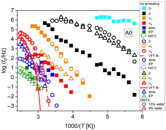 For Ta = 100 °C (same data as in Figure 4), the water content should have decreased, although a residual of a few percent is still to be expected. The detected processes are shown in Figure 5 as the round symbols. The β process becomes slower than in the case of no annealing and assumes a more marked VFT trend. It is therefore likely that the present process can be ascribed to the dynamics of confined water “slaved” by the dynamics of macromolecules [23,24]. An intermediate process appears that cannot be ascribed to the αa one, since by a decrease in water content, the glass temperature is expected to increase. We tentatively label this process as an αc one, due to the supposedly increased crystalline fraction due to thermal annealing. Its trend is an Arrhenius one, although a slight steepening can be noticed at higher temperatures, that could be associated with the phenomenon of slow solvent relaxation observed in Ref. [24], named as νs in Figure 4.