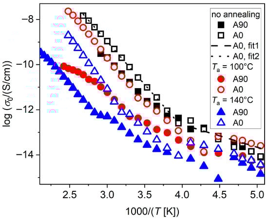 In Figure 3c, the spectral data of tanδ = ε″/ε′ for the A0 sample annealed at Ta = 100 °C, for the temperature of 140 °C, are shown. In this illustrative spectrum, tanδ shows one peak, and a plateau at low frequency. Indeed, by choice of the conductivity function of Equation (2), the low-frequency limit of tanδ is a constant value, related to the conductivity exponent n [30], and this is confirmed by our measurements at low frequency and high temperatures.